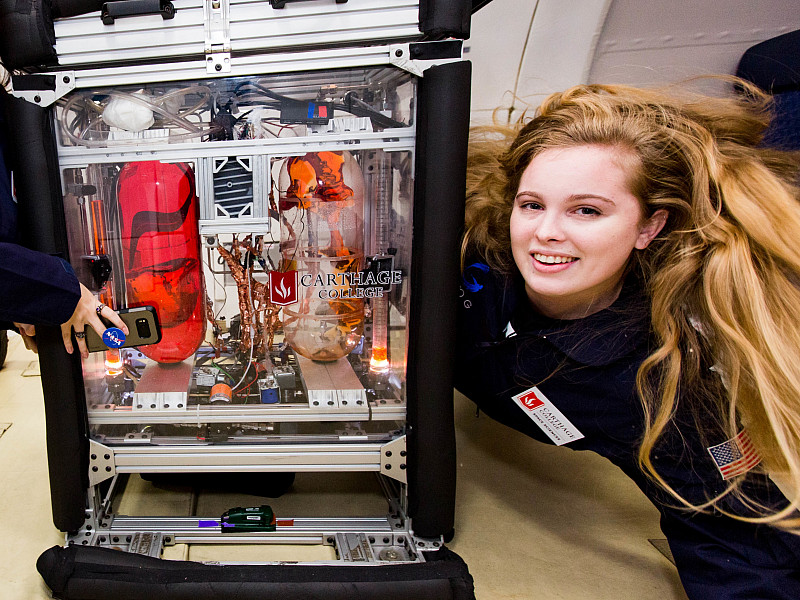 Celestine Ananda ’20 will work at Kennedy Space Center in Florida to continue development of the Modal Propellant Gauging technology. The MPG project, begun at Carthage in 2010, is now a NASA program to develop a method of measuring propellant in spacecraft with high resolution. Celestine has been involved in the project since she arrived at Carthage and will continue the work at KSC, developing hardware designs for experiments on International Space Station, while evolving designs she developed for suborbital rocket flights on Blue Origin’s New Shepard vehicle.